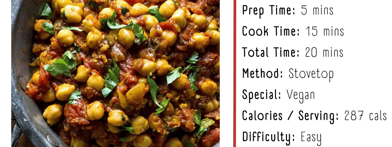This healthy Indian recipe is a flavorful chickpea curry that you can make in just 20 minutes. Also called chana masala, this dish is a comforting and delicious dinner.