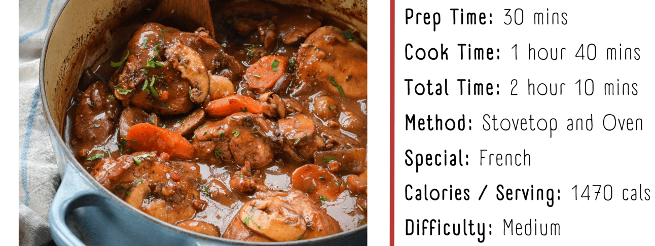 Elevate your dining experience with this classic French masterpiece. Succulent bone-in chicken thighs dance in a rich mixture of red wine, mushrooms, and pancetta, creating quite the elegant stew. It gets even better with time and is perfect for cozy evenings 🥓🇫🇷
